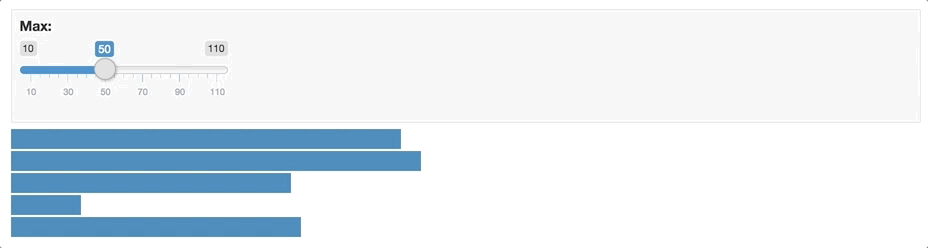 data — The R data converted to JavaScript.svg — The svg container for the visualizationwidth — The current width of the containerheight — The current height of the containeroptions — Additional options provided by the usertheme — Colors for the current themeWhen you are learning D3 or translating D3 examples for use with R it’s important to keep in mind that D3 examples will generally include code to load data, create an SVG or other root element, and establish a width and height for the visualization.