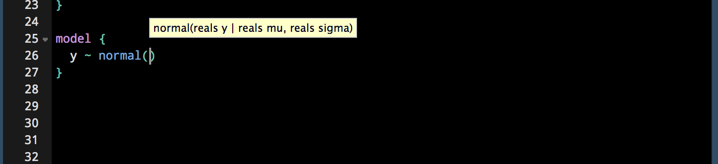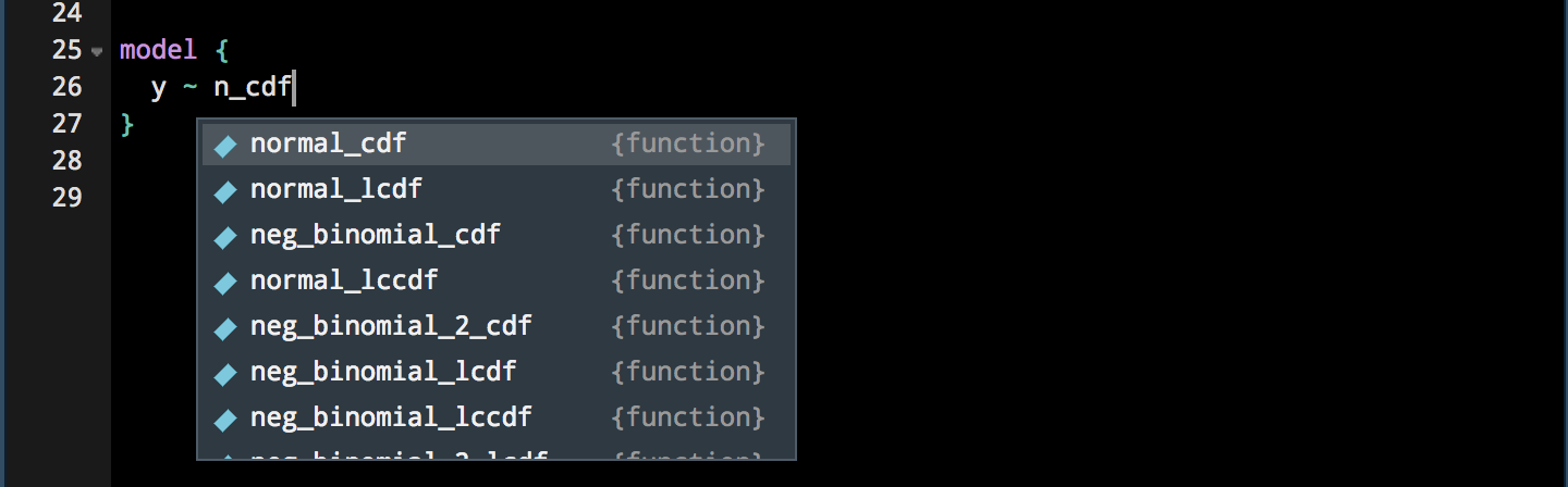 RStudio provides autocompletion results for Stan functions, drawing from the set of pre-defined Stan keywords and functions. The same autocompletion features you might be familiar with in R, like fuzzy matching, are now also available in Stan programs.
