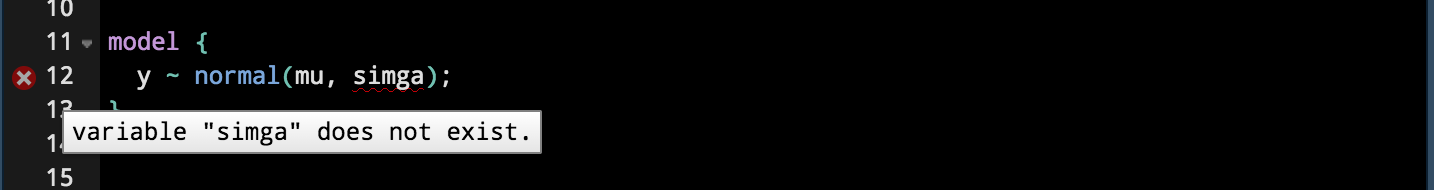 If the Stan compiler discovers any issues in your model, RStudio’s diagnostics will show you exactly where those issues live so you can fix them quickly and easily.